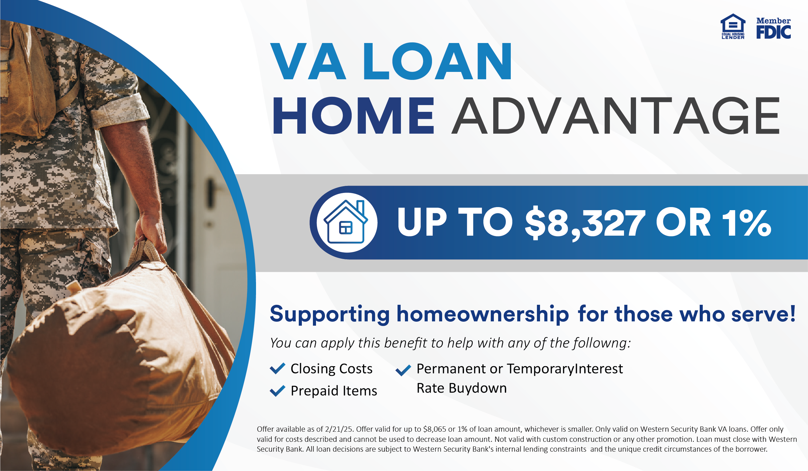 Take advantage of our VA Loan and get a discount when you finance through Western Security Bank. We're here to make your homeownership journey as smooth as possible, and we're proud to support you every step of the way. Reach out to a lender today. Thank you for your service!